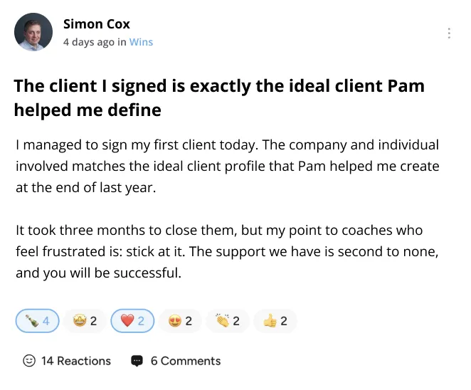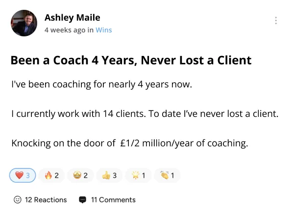 By his first year, he hit £250,000, doubling and then tripling his earnings in the next two years. Now, he's been our global coach of the year for three years, without ever losing a client. He credits us with teaching him how to win and keep high-value clients.